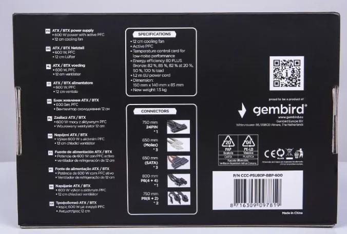 Gembird (600W) (1x120mm) 80+Bronze [CCC-PSU80P-BBP-600]