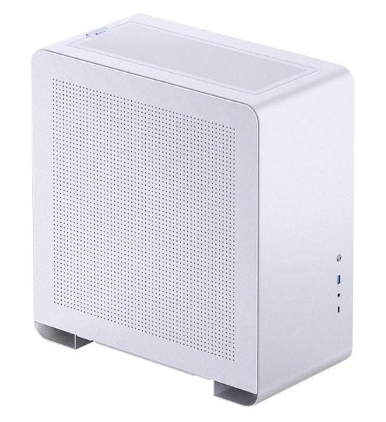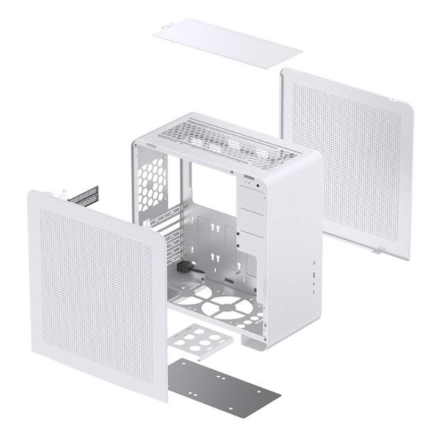 Zewnętrznie U4 Pro firmy Jonsbo zachwyca subtelnym i przejrzystym designem, stylowym panelem bocznym z siatką i nieskazitelnym wykonaniem. Midi Tower oferuje wyłącznik zasilania, port USB-C 3.1 i USB 3.0, a także połączone gniazdo audio po prawej stronie. Midi Tower oferuje mnóstwo miejsca na mocny sprzęt i umiejętnie go eksponuje. Dzięki wymiarom 205 na 426 na 395 milimetrów U4 Pro firmy Jonsbo jest nadal dość kompaktowy, ale w środku można zmieścić pełnowymiarowy sprzęt do gier. Oprócz płyt głównych Mini-ITX i Micro-ATX i ATX jest też miejsce na karty graficzne o długości do 330 milimetrów . Dzięki siedmiu gniazdom jest wystarczająco dużo miejsca na karty rozszerzeń, takie jak karty przechwytujące lub karty dźwiękowe.