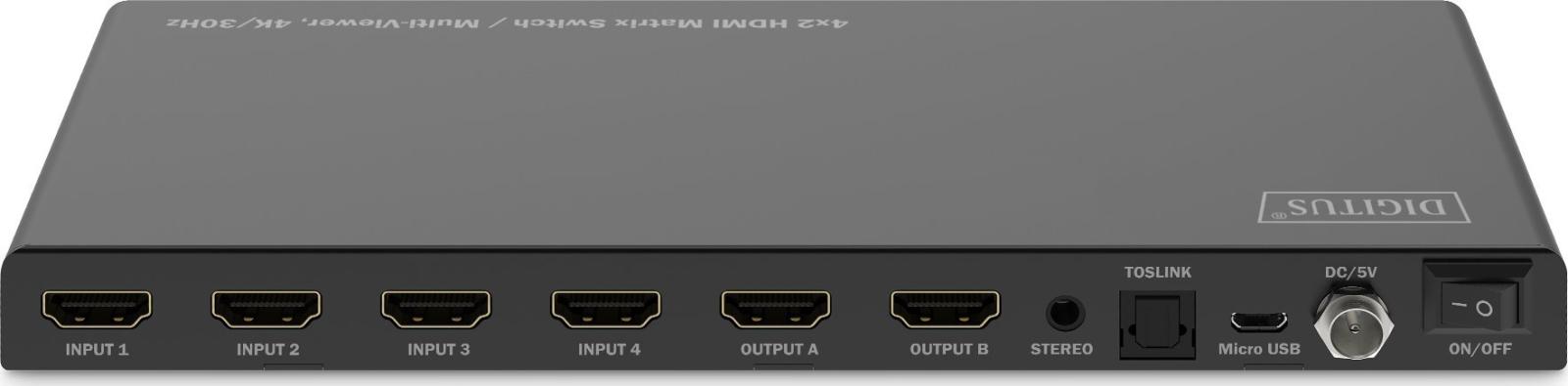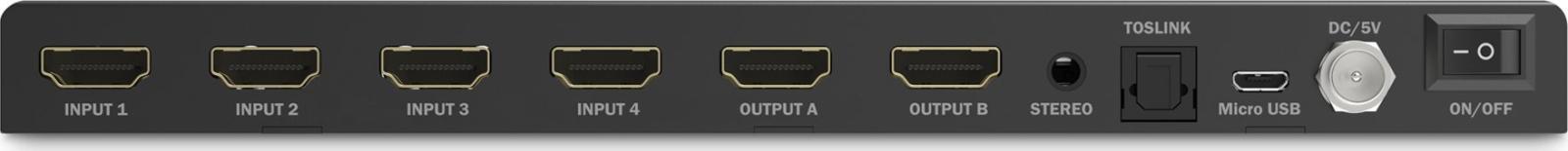 Interfejsy: 2 × wyjście HDMI, 4 × wejście HDMI, 1 × wyjście TOSLINK, 1 × wyjście audio mini jack, 1 × zarządzanie (micro-USB)