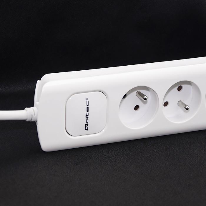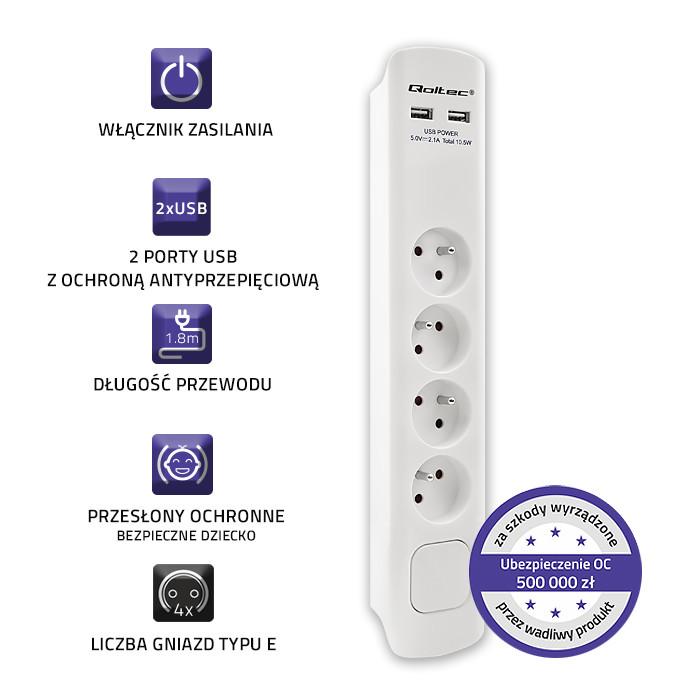 Qoltec (1.8m) biały (4 gniazda, włącznik, 2xUSB) [50282]