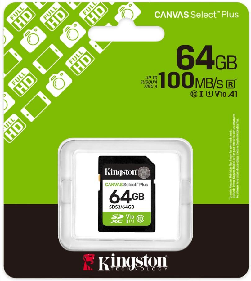 Secure Digital 64GB Kingston CANVAS Select Plus Gen3 SDXC 100R Class 10 U1 UHS-I V10 (100MB/s) [SDS3/64GB]